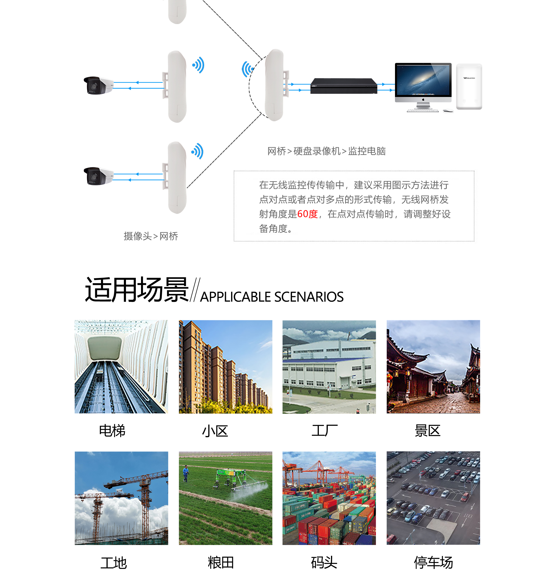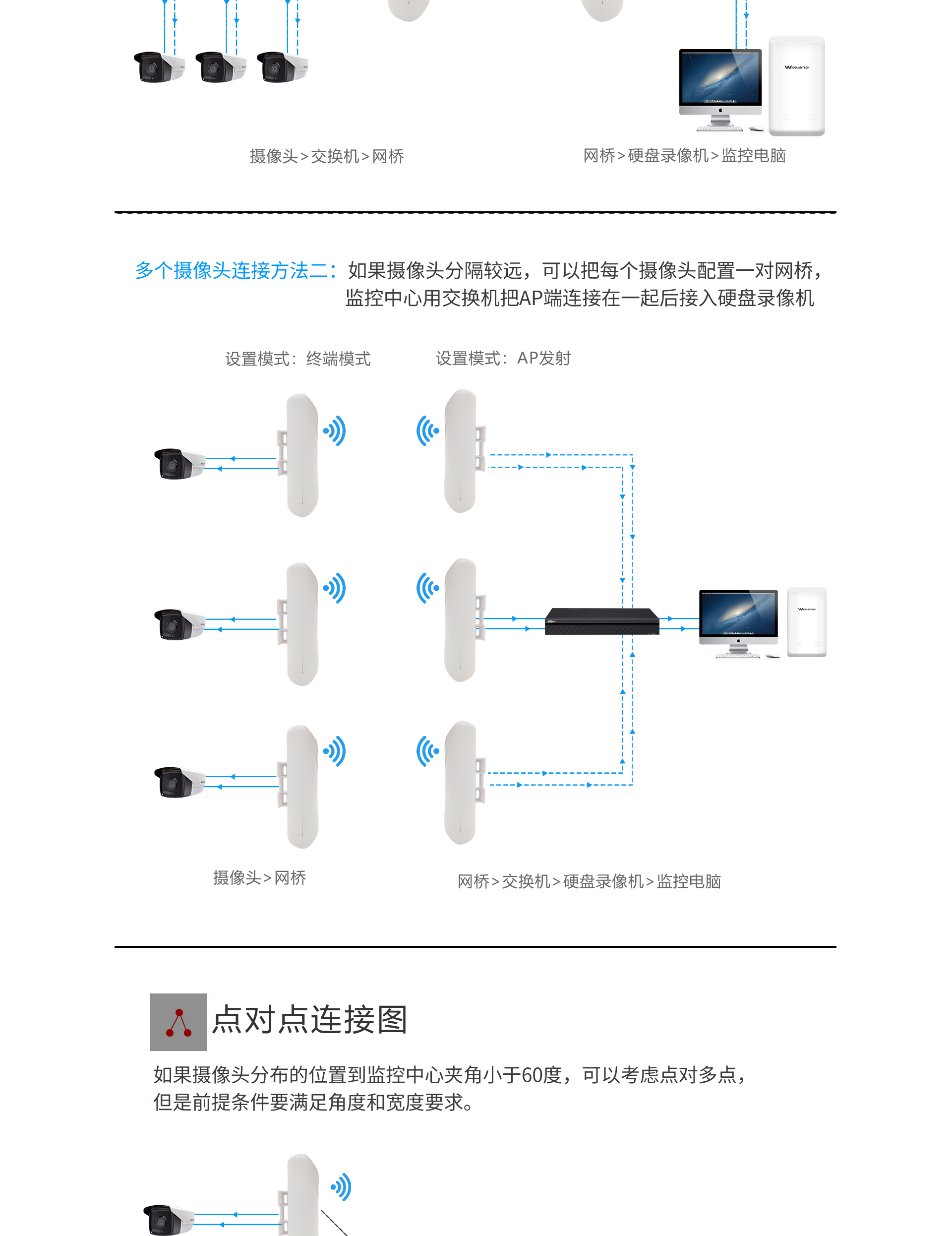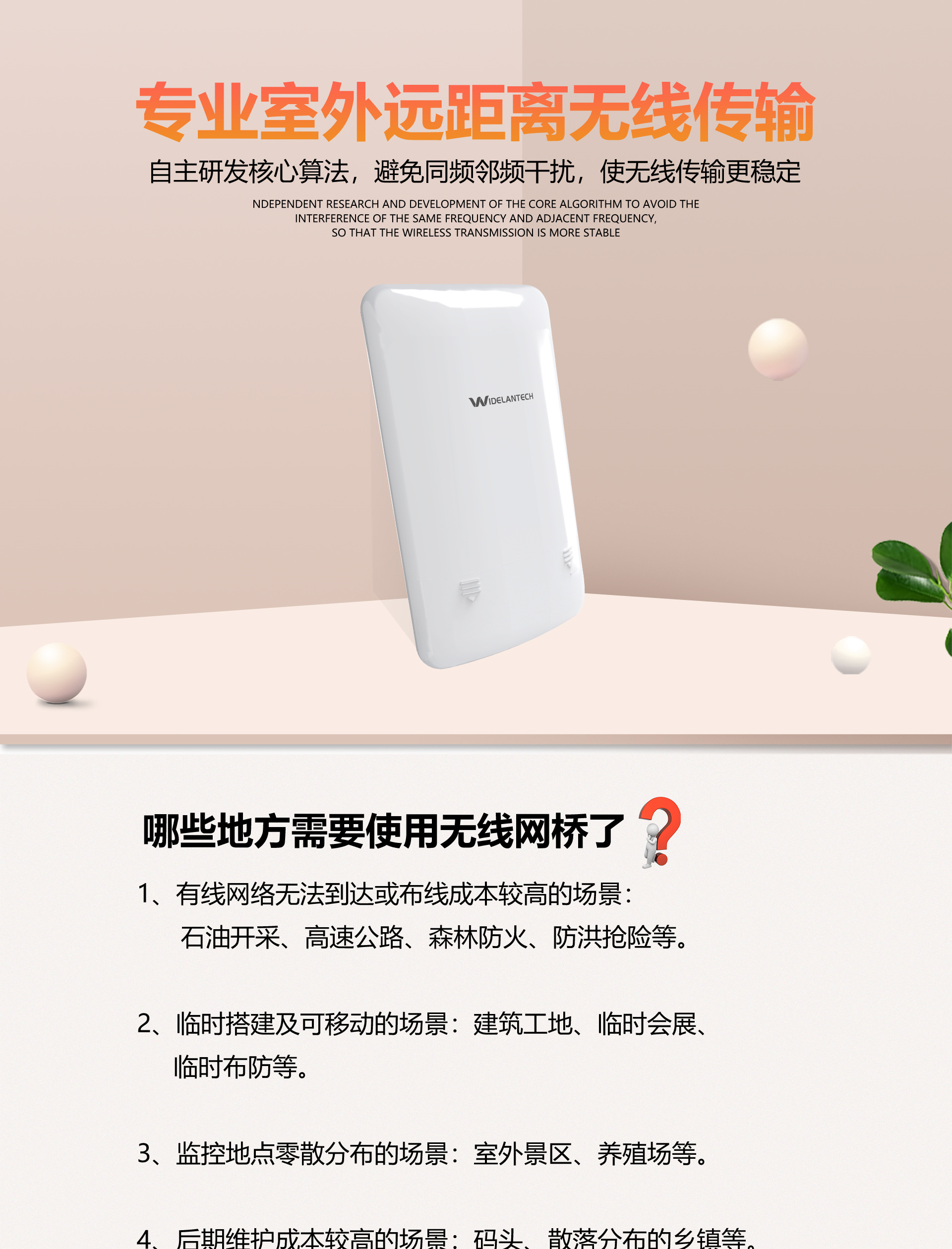 ·专业室外壳体设计,适应各种恶劣环境·WEB管理系统提供丰富的软件功能·支持点对点、点对多点多种连接方式,使用场景更为丰富·内置8dBi定向天线,无线传输距离可达1千米·支持24V Passive PoE供电,无需外接电源·抱杆/壁挂安装,维护简便