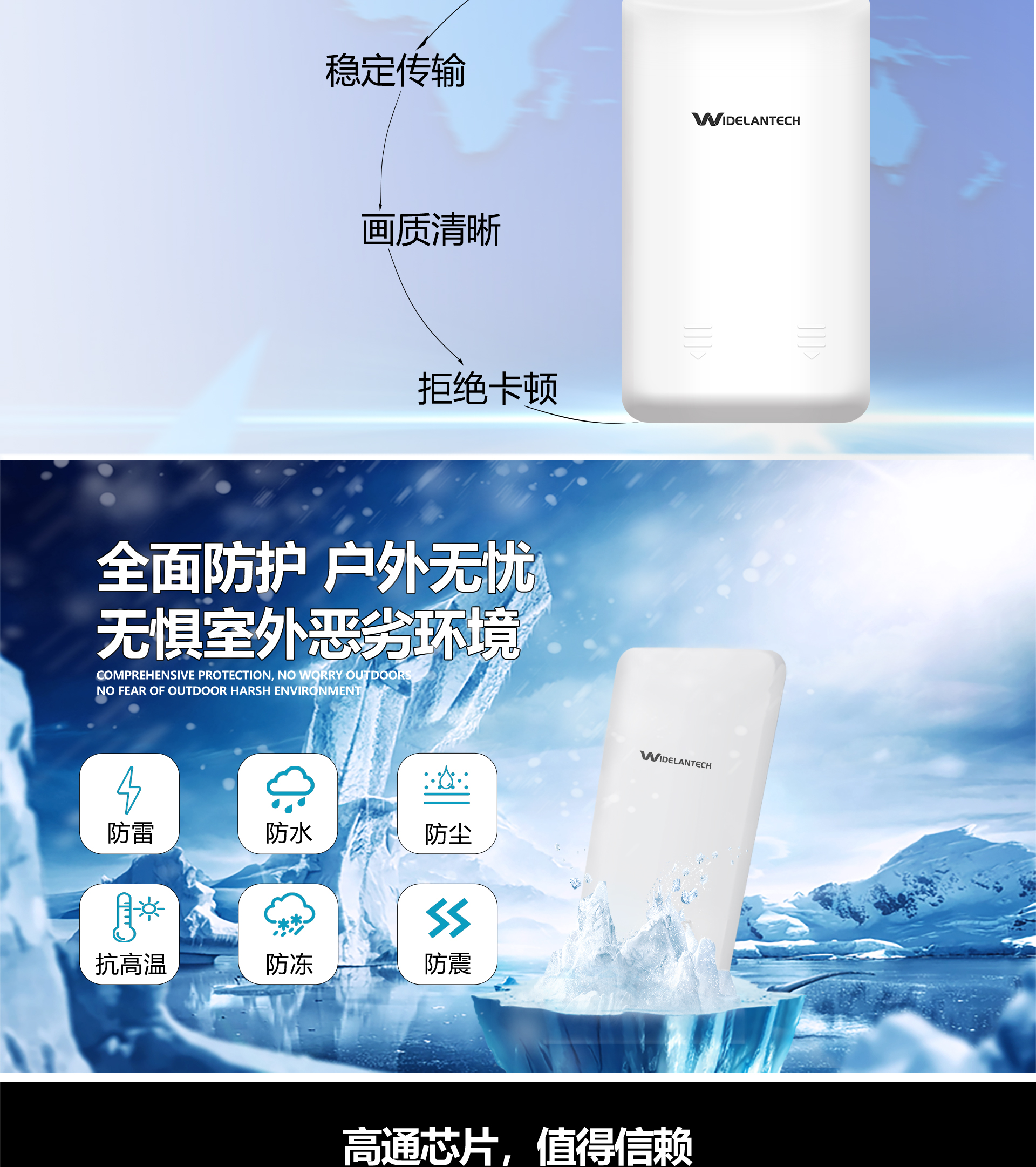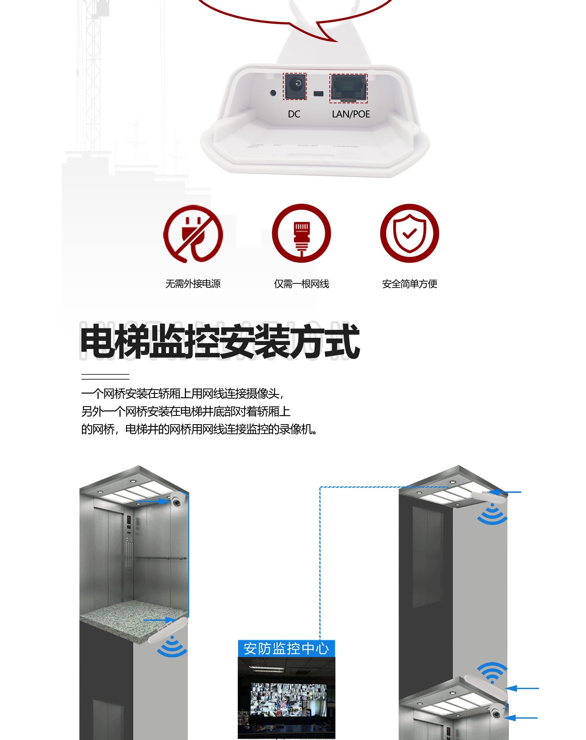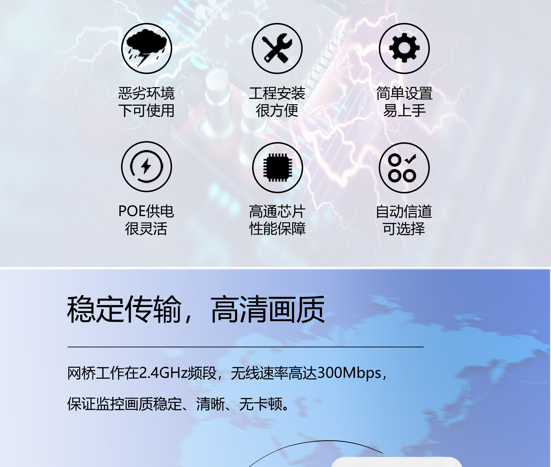 ·专业室外壳体设计,适应各种恶劣环境·WEB管理系统提供丰富的软件功能·支持点对点、点对多点多种连接方式,使用场景更为丰富·内置8dBi定向天线,无线传输距离可达1千米·支持24V Passive PoE供电,无需外接电源·抱杆/壁挂安装,维护简便