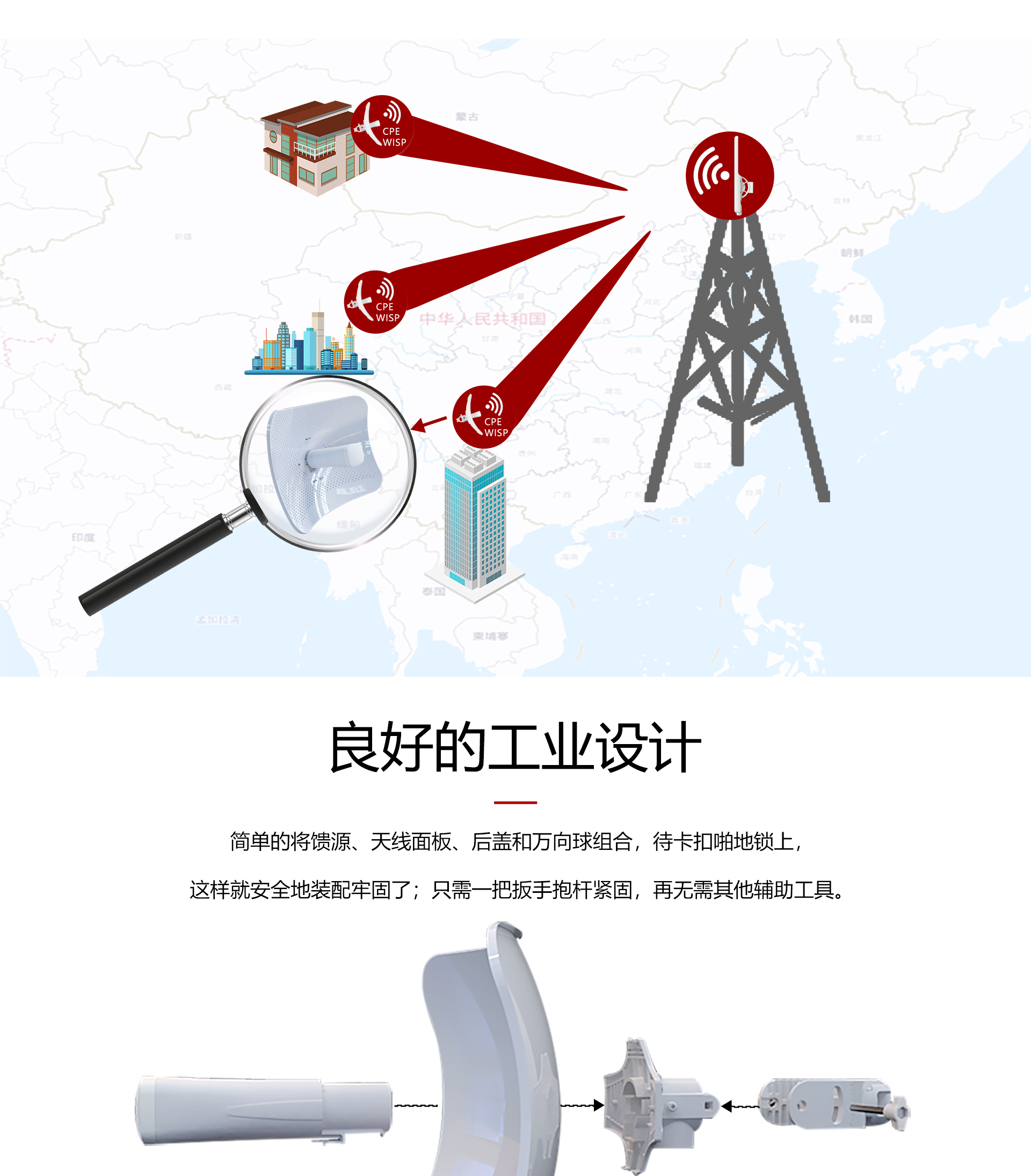 ·专业室外壳体设计,适应各种恶劣环境·WEB管理系统提供丰富的软件功能·支持点对点,点对多点多种连接方式,使用场景更为丰富·外置23dBi高增益天线,无线传输距离高达10千米·支持24V Passive PoE供电,无需外接电源·抱杆/壁挂安装,维护简便