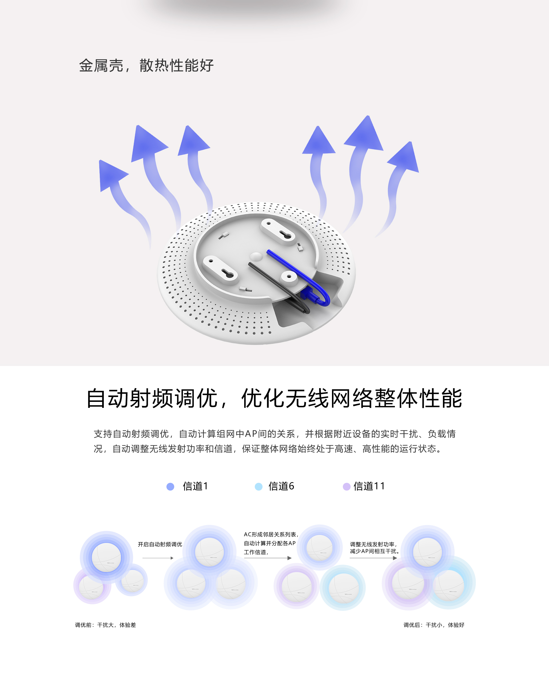 .新一代 Wi-Fi 6 (802.11ax)技术.11AX 2.4G/5.8G 双频并发,无线速率高达2976Mbps. 采用高性能ARM四核CPU.无线发射功率线性可调,根据需求调整信号覆盖范围.简易吸顶式安装,802.3at标准PoE网线供电薄款设计,极具美观特性.支持OFDMA技术,使的多设备可以同时通信,从而提升效率和降低时延.实现多终端同时通信,突破无线传统竞争弊端.支持智能负载均衡.支持硬件看门狗,保障系统的可靠性